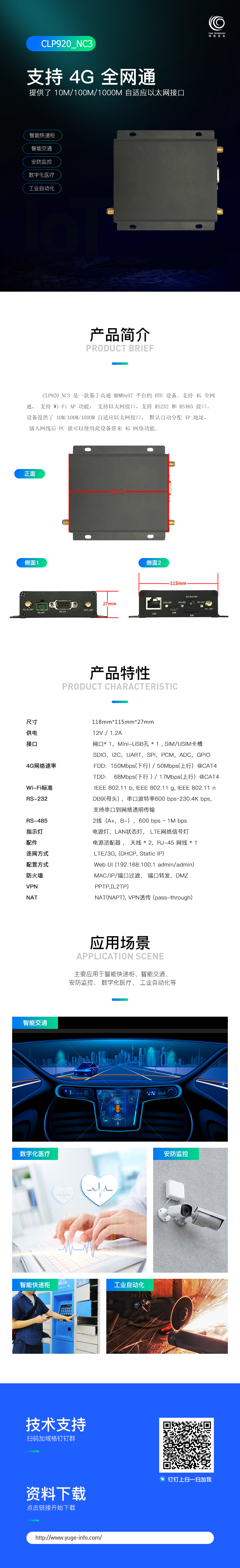 CLP920_NC3 是一款基于高通 MDM9x07 平臺的 DTU 設(shè)備。支持 4G 全網(wǎng)通, 支持 Wi-Fi AP 功能, 支持以太網(wǎng)接口,支持 RS232 和 RS485 接口。